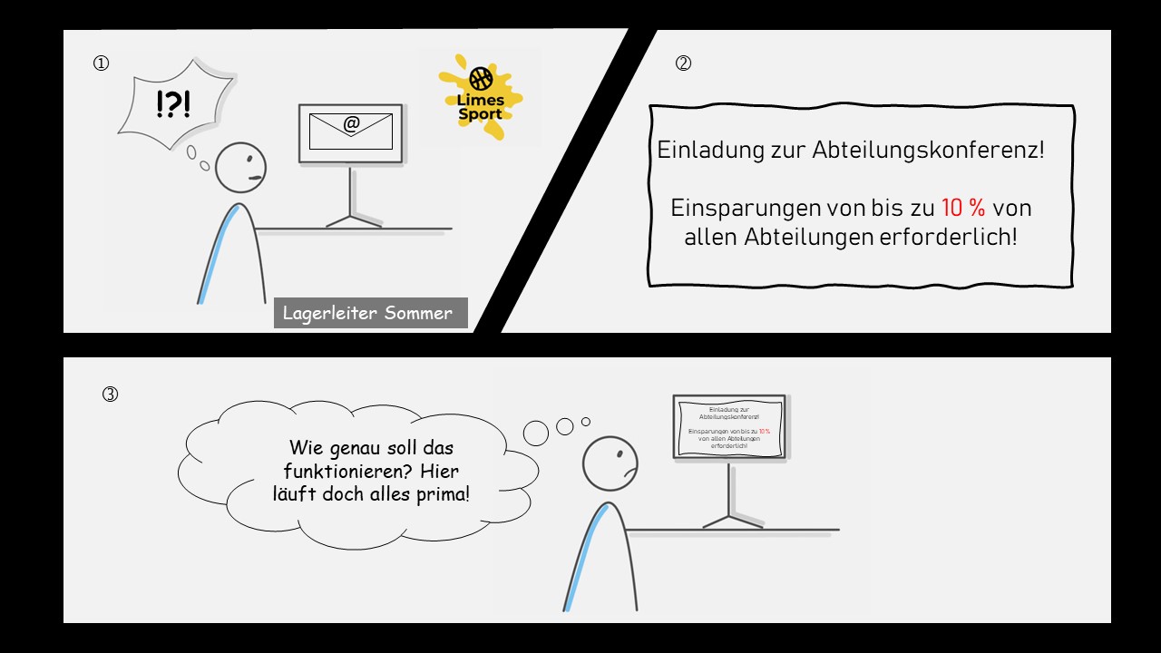 Die Umsätze sind in den letzten Monaten stetig gesunken. Ein Grund sind günstigere Preise bei den Wettbewerbern. Um mit diesen Preisen mithalten zu können, müssen Kosten eingespart werden. Alle Abteilungen sind aufgerufen, ihre Wirtschaftlichkeit zu überprüfen und Ideen zur Kosteneinsparung zu entwickeln.  Auf der Abteilungskonferenz sollen die Ideen präsentiert werden.