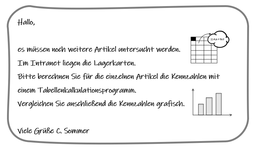 Die Lernenden erarbeiten sich zunächst die Lagerkennzahlen (∅ Lagerbestand in Stück und €, Lagerumschlagshäufigkeit und ∅ Lagerdauer). Nach dem Vergleich mit den Vorjahres- und den Branchenwerten können geeignete Maßnahmen abgeleitet werden. Zusätzlich bietet der Kurs die Möglichkeit, die Lagerkennzahlen mit einem Tabellenkalkulationsprogramm zu berechnen und den Vergleich in Form eines Diagramms darzustellen.