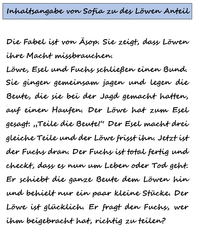 1. Besprechen Sie die Inhaltsangabe zu Äsops Fabel "Des Löwen Anteil" und überprüfen Sie anhand Ihrer Checkliste, was Sofia nicht beachtet hat.