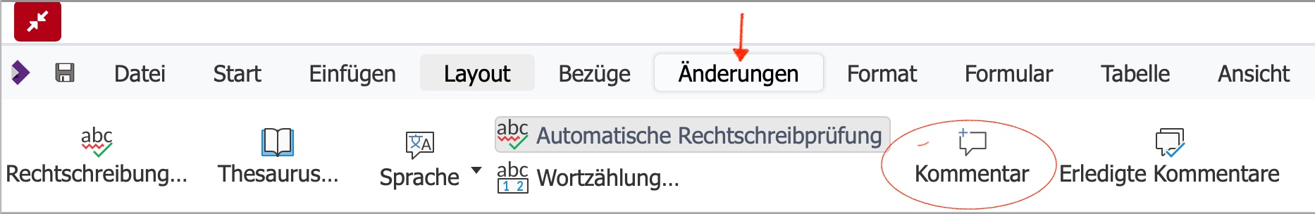 Zum Kommentieren wählen Sie die Registerkarte "Änderungen" und klicken dann auf "Kommentar".