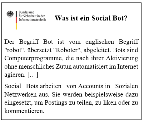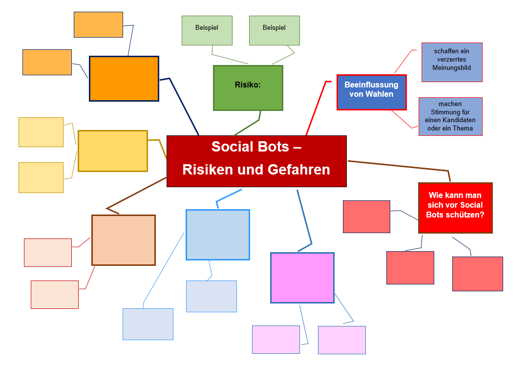 - Zu jeder möglichen Gefahr, die von Social Bots ausgeht, sollten Sie ein oder besser zwei Beispiele notieren.