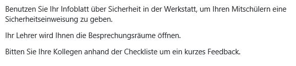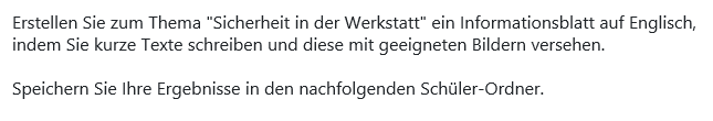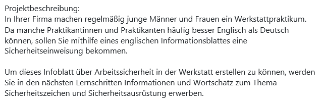 In your company, young men and women regularly do internships in the workshop. Since some of the interns often speak better English than German, they should be given a safety briefing with the help of an English information sheet.