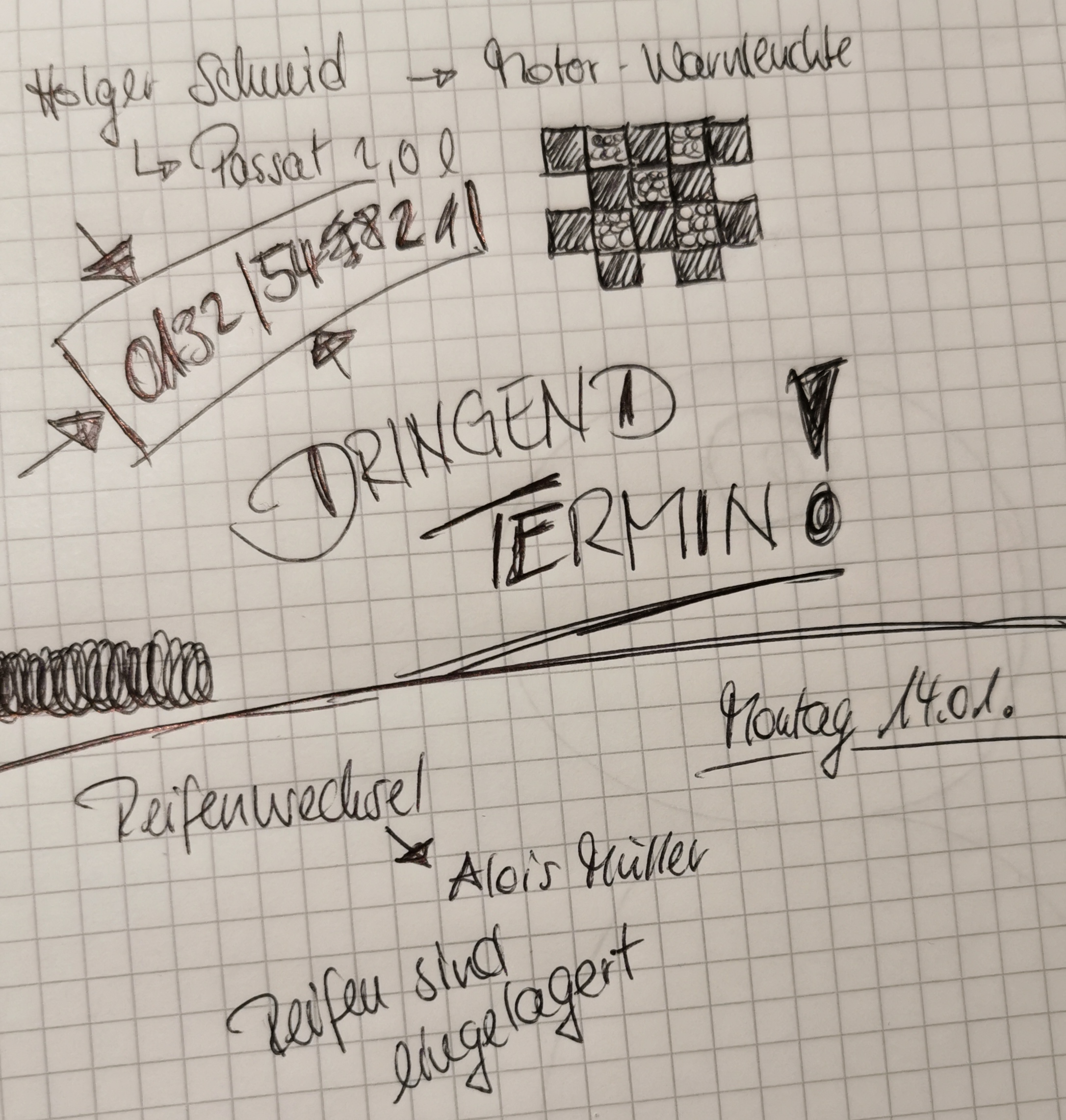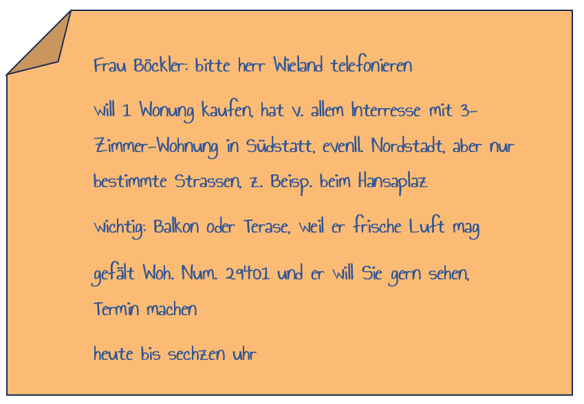 Frau Böckler ist selbständige Immobilienmaklerin. Als sie nach der Mittagspause zurück in ihr Büro kommt, findet sie diese Gesprächsnotiz: