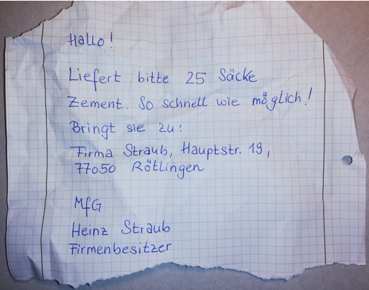 1. Diskutieren Sie, ob es sich bei diesem Schreiben um einen Geschäftsbrief handelt.Begründen Sie Ihre Meinung.2. Formulieren Sie eine Betreffzeile und besprechen Sie, welche Informationen der Empfänger zur Bearbeitung benötigt. -
