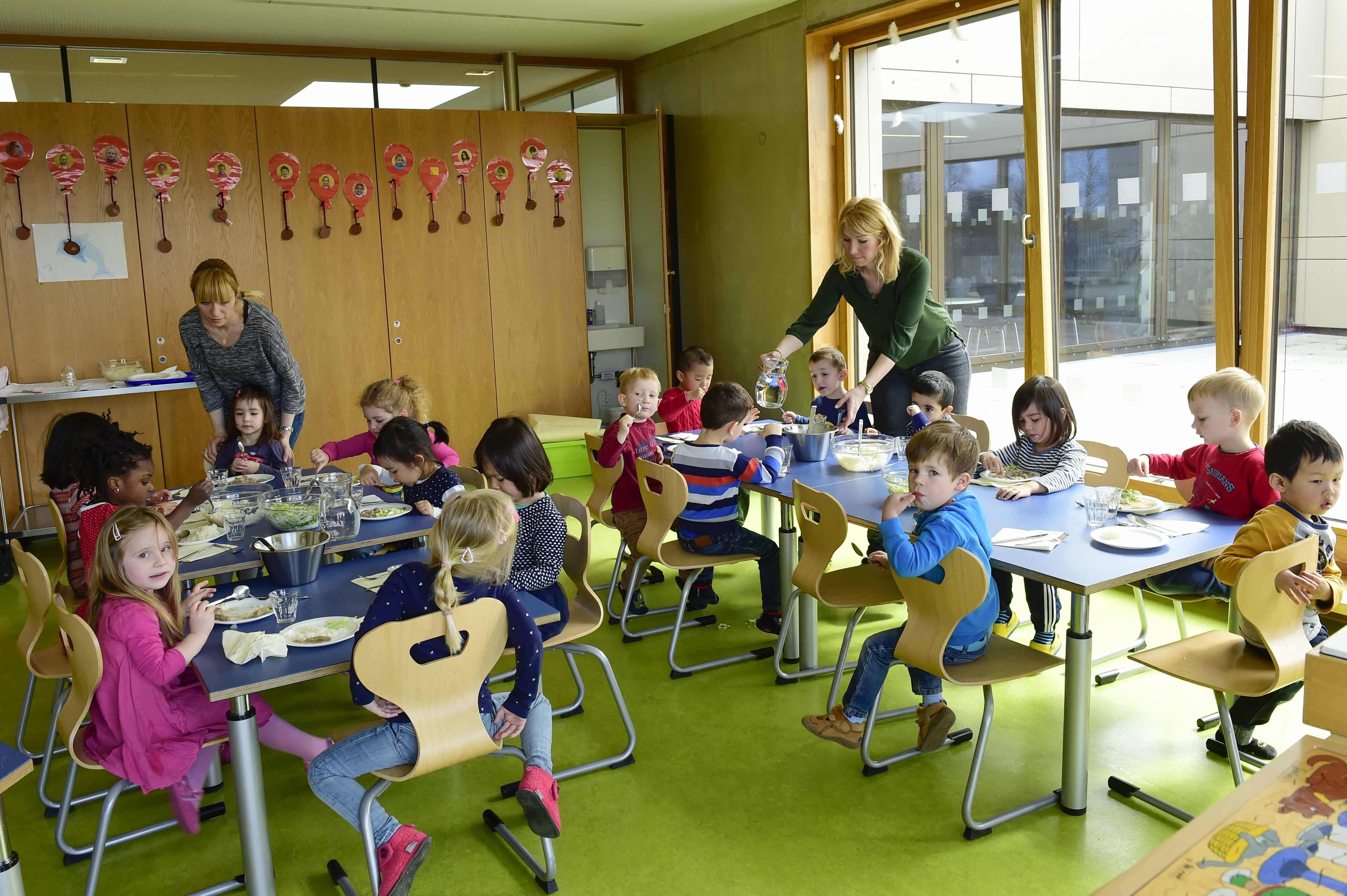 Donnerstags wird gemeinsam mit 4-5 Kindern einer Gruppe das Frühstück zu einem gewählten Thema, z. B. Jahreszeit, aus unseren Gärten, alles selbstgemacht, aus einer bestimmten Region oder einem bestimmten Land, unsere Sinne vorbereitet: saisonales und regionales Gemüse und Obst aus dem EU-Schulprogramm geschnitten, ein Kräuterquark gerührt oder in der Weihnachtszeit Plätzchen gebacken. Immer wieder werden auch die Eltern der Kinder zum Vorbereiten und gemeinsamen Frühstücken eingeladen. Hierfür wird die Frühstückstafel passend zum Thema von den Kindern festlich geschmückt, es gibt feste Plätze und entsprechende Rituale bilden den Rahmen dieses gemeinsamen Gruppenfrühstücks.