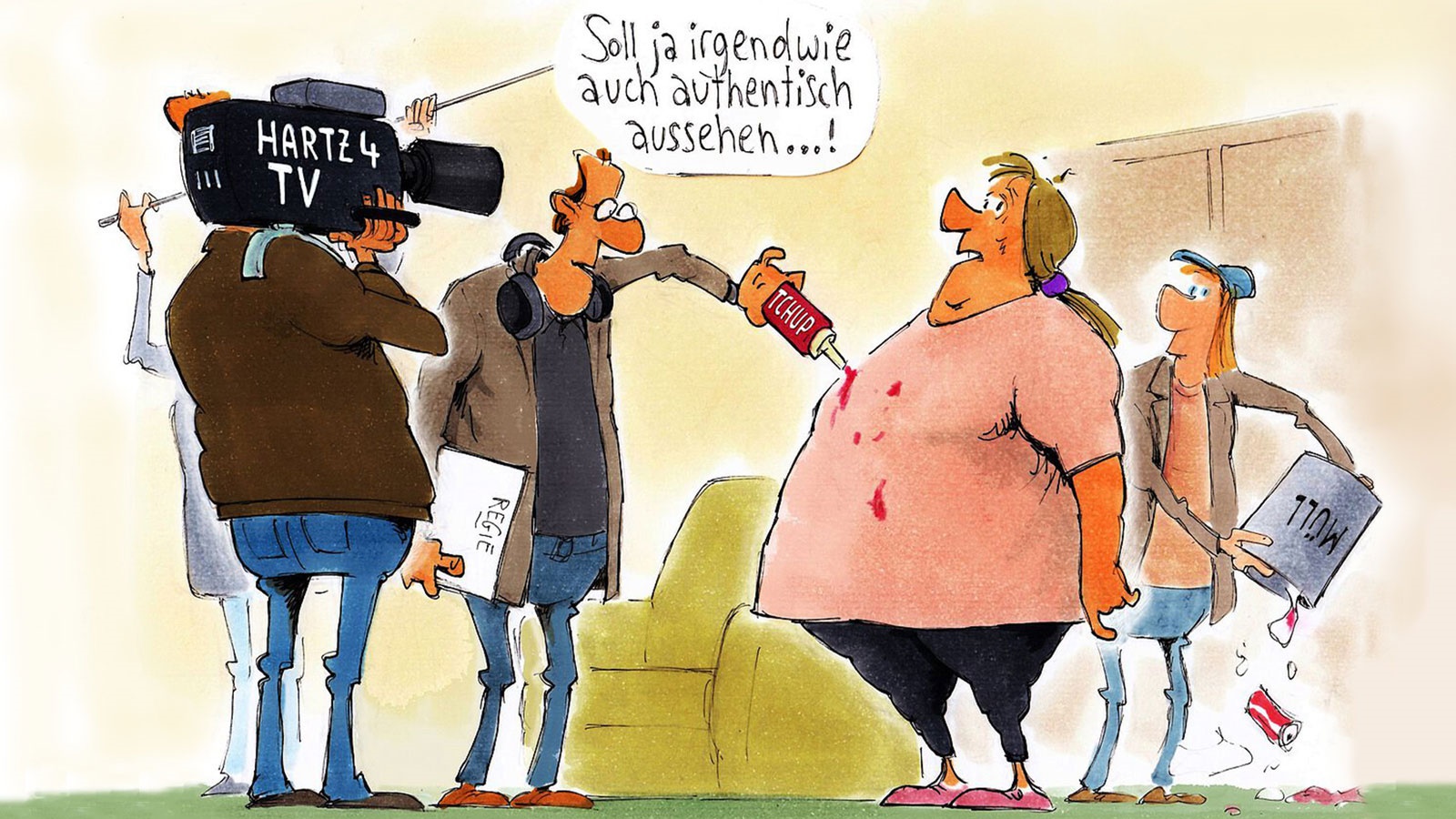 Quelle: Gerhard Mester2. Beschreiben Sie die Karikatur.3. Interpretieren Sie die Aussage der Karikatur vor dem Hintergrund der Glaubwürdigkeit von Medien.Stellen Sie sich vor, Sie sehen den Beitrag des Videoteams im Internet. Es entsteht eine Diskussion über die Glaubwürdigkeit des Videos. Sie nehmen an der Diskussion teil.4. Nehmen Sie in Form eines Kommentares in der Diskussion Stellung dazu, wie sich andere Menschen vor dieser Medienmanipulation hätten schützen können. -
