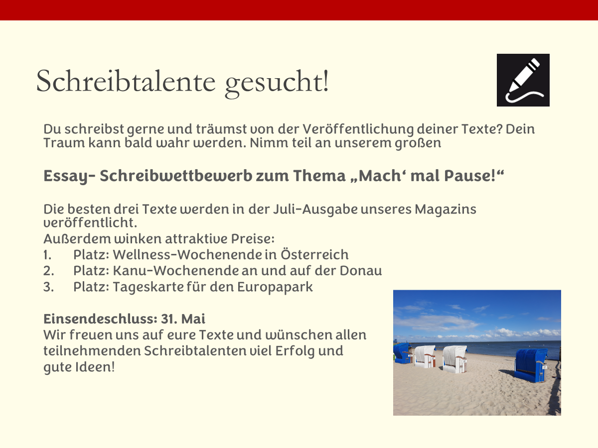 1. Verfassen Sie auf der Grundlage Ihres Schreibplans einen Essay zum Thema „Mach` mal Pause“. Gerne dürfen Sie einen anderen Titel wählen, falls Sie einen für Ihren Essay passenderen Titel finden. Verwenden Sie Ihre „Goldenen Regeln“ und überprüfen Sie Ihren Essay am Schluss mit der Checkliste.