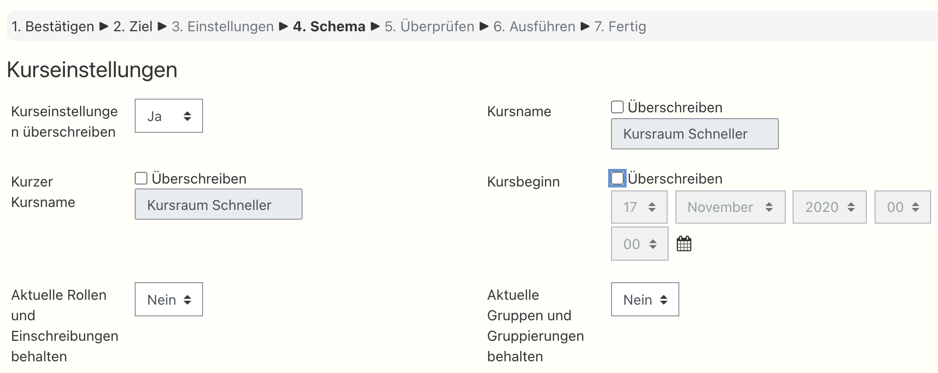 4.) Bei den Kurseinstellungen sollten Sie im ersten Feld "ja" auswählen, damit der Kurs genau so wiederhergestellt wird, wie er in MOOVE aussieht. Entscheiden Sie, ob Sie den Kursnamen, den kurzen Kursnamen und den Kursbeginn überschreiben wollen und entfernen Sie ggf. die gesetzten Häkchen.