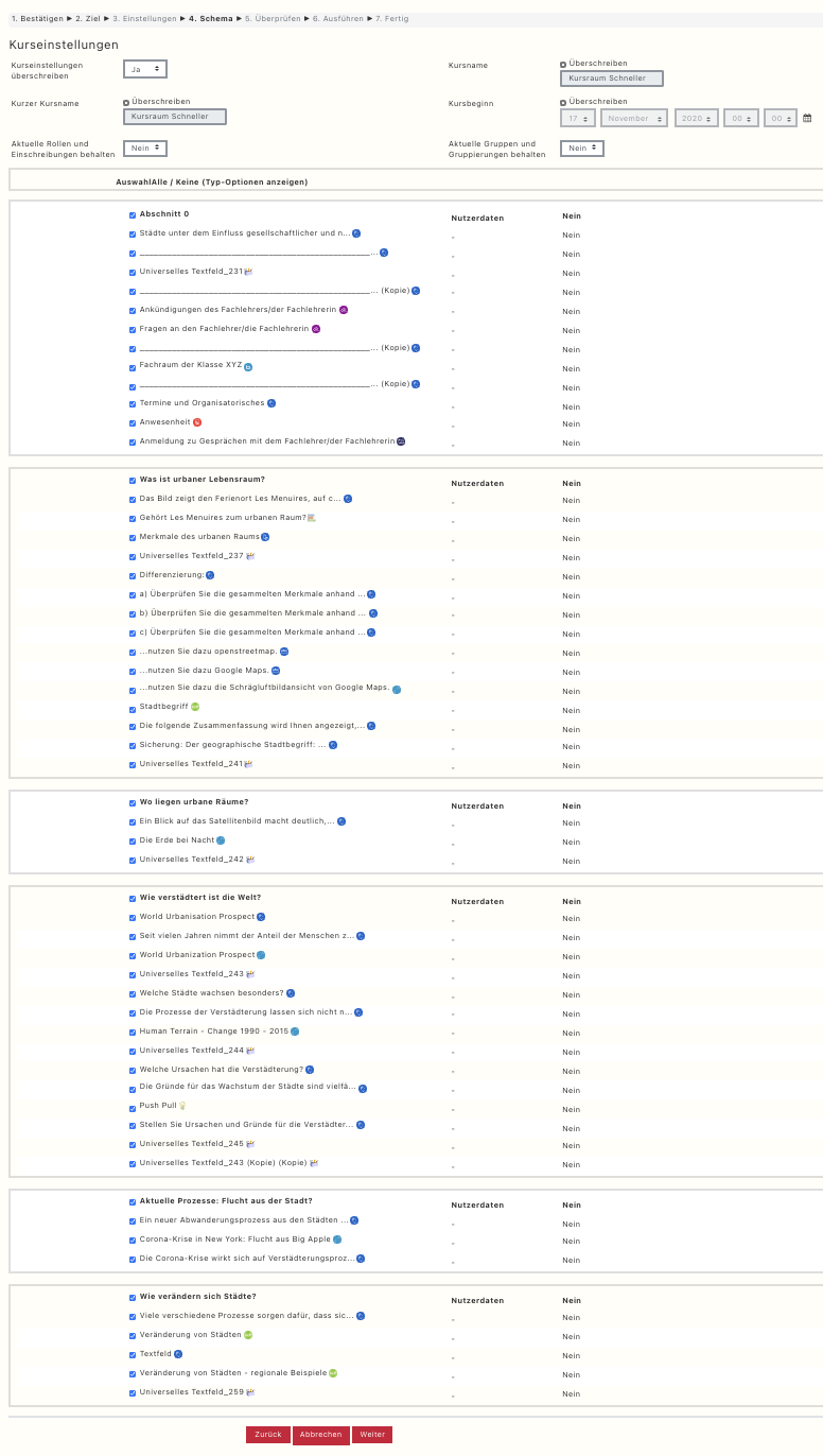 Darunter können Sie (- wenn Sie möchten -) noch Themen oder einzelne Aktivitäten aus dem Kurs entfernen, in dem Sie die gesetzten Häkchen an den entsprechenden Stellen entfernen.