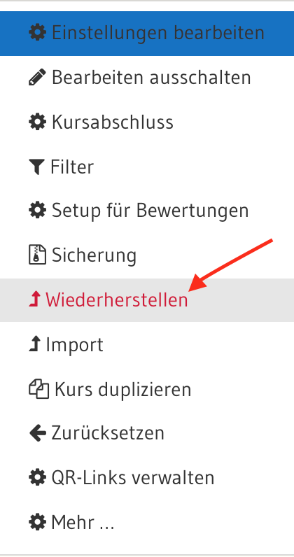 Sobald Sie den gewünschten Kurs gesichert haben, können Sie ihn in ihrem eigenen Schul-Moodle wiederherstellen. Dazu brauchen Sie einen leeren Moodle-Kursraum, in dem Sie Trainerrechte haben.