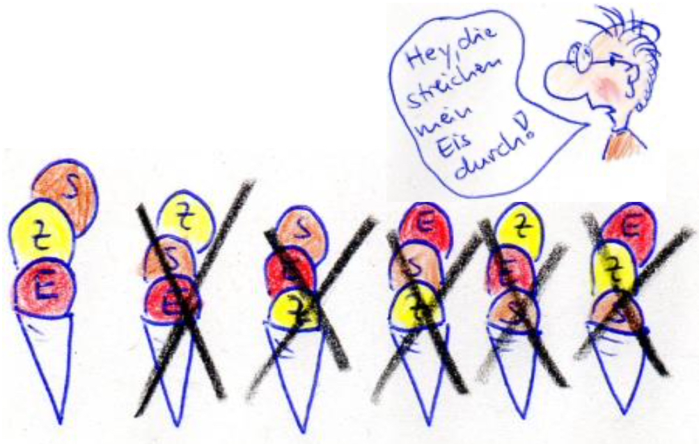 Aufgabe 3c)   Notiere in dein Übungsheft: Wie viele Möglichkeiten hast du nun aus 5 Sorten drei Kugeln Eis auszuwählen, wenn die Reihenfolge (wegen des Bechers) wurscht ist? Wenn du nicht draufkommst: keine Panik - 3d) hilft dir dann nachher weiter!