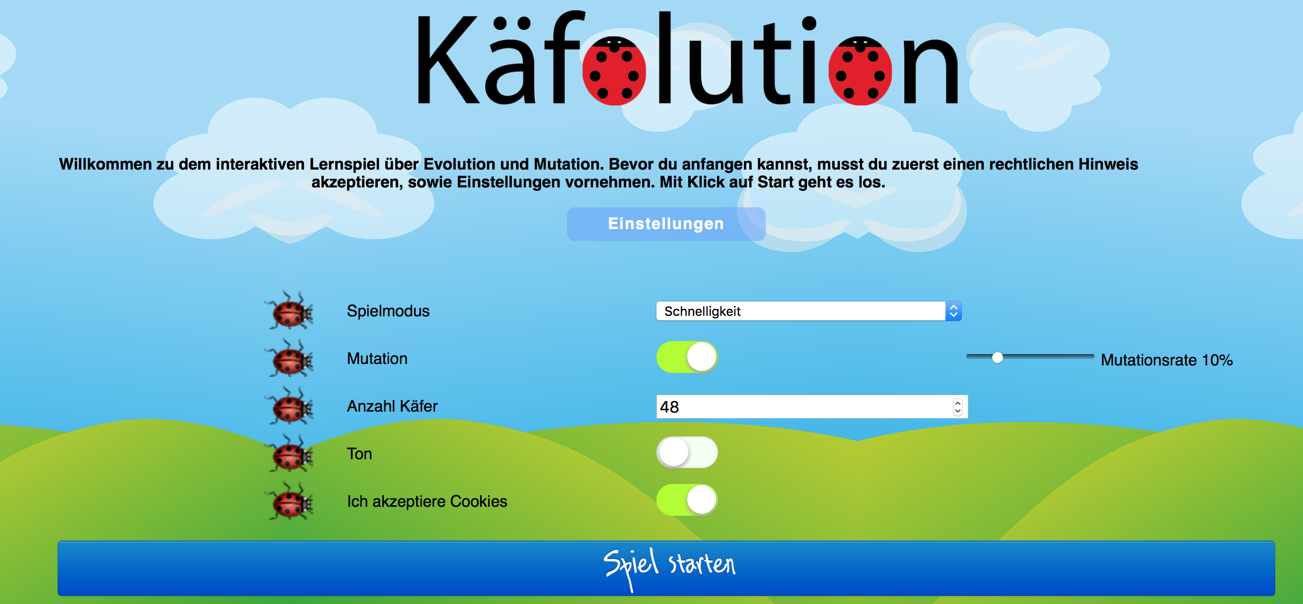 Danach kannst du "nach dem Lustprinzip" einige Runden spielen, in denen du Einstellungen variierst [z.B. bei Spielmodus, Anzahl Käfer, Mutationsrate; Cookies müssen immer akzeptiert werden].