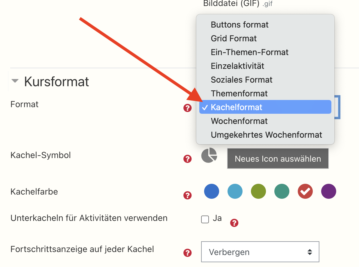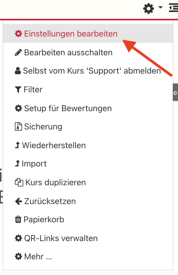 Sobald Sie den gewünschten Kurs gesichert haben, können Sie ihn in ihrem eigenen Schul-Moodle wiederherstellen. Dazu brauchen Sie einen leeren Moodle-Kursraum, in dem Sie Trainerrechte haben. Falls dieser Kurs im Themenformat ist, stellen Sie diesen vor dem Wiederherstellen der Sicherung über die "Einstellungen bearbeiten" ins Kachelformat um.