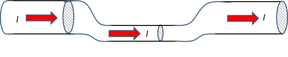 Denn wenn die Stromstärke links größer wäre als in der Mitte, dann müsste sich der strömende Stoff irgendwo dazwischen stauen und den Druck anwachsen lassen. Wenn hingegen die Stromstärke links kleiner wäre als in der Mitte, dann müsste auf dem Weg zur