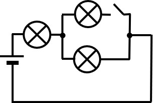Alle Lampen der abgebildeten Schaltung haben den gleichen Widerstand von 20 Ω. Die Batterie liefert eine Spannung von 6 V.