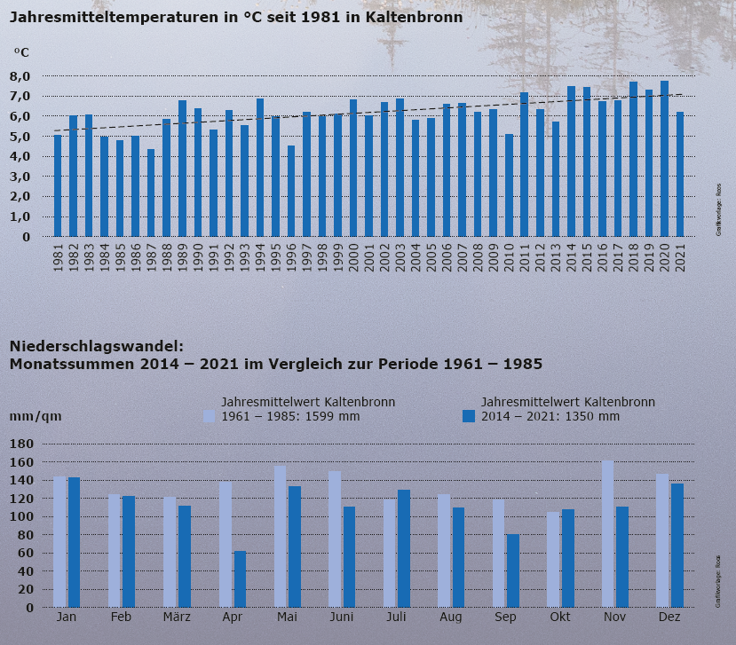 Auch auf dem Kaltenbronn lassen sich die klimatischen Veränderungen erkennen. In den Jahren von 1981 bis 2021 ist ein deutlicher Anstieg der Jahresmitteltemperaturen zu sehen.