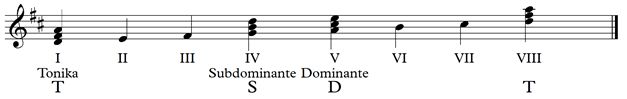 Die wichtigsten Begleit-Akkorde stehen auf der I. Stufe (Tonika), der IV. Stufe (Subdominante) und der V. Stufe (Dominante), Kurzformen T, S, D. Tonika, Subdominante und Dominante heißen auch „Funktionen“.