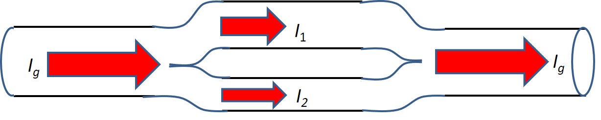 Da in desem Fall verschiedene Leiterstücke mit ihren Eigenschaften wie Länge, Durchmesser und spezifischen Widerstand parallel verlegt werden, ändert sich auch das Strömungsverhalten des fließenden Stoffes. Denn der Strom wird sich am Knotenpunkt zunächst aufteilen, um dann später wieder zusammenzukommen.