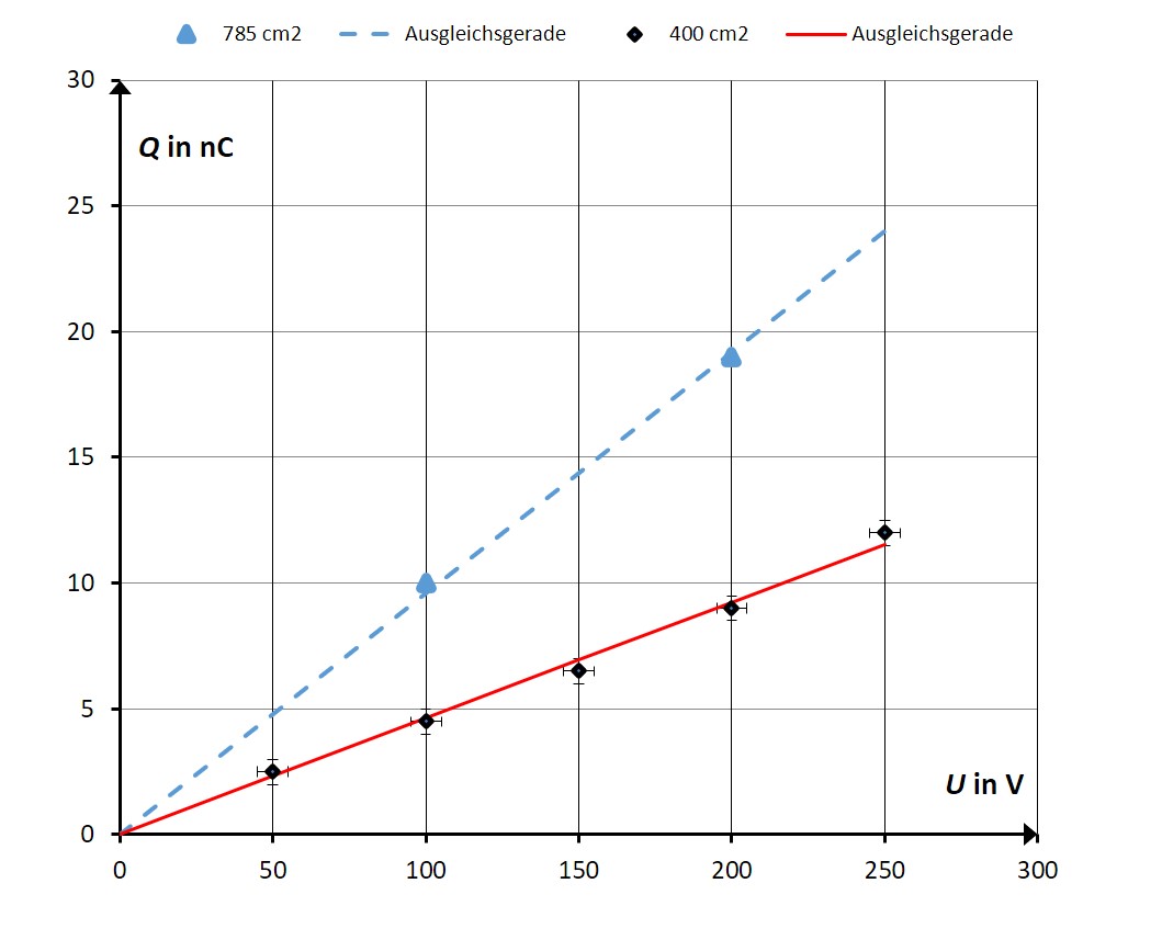 Daraus folgt, dass für eine feste Spannung U die Ladung Q proportional zur Plattenfläche A ist: Q ~ A