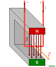 Diese Kraft hat eine Richtung, die orthogonal zur Stromrichtung und orthogonal zur Richtung des Magnetfeldes liegt. Beschrieben wird die Richtung der Kraft durch die Linke-Hand-Regel für