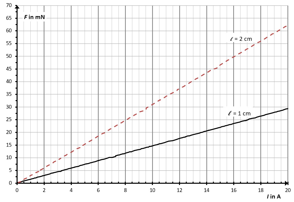 Abbildung 1: Die Kraft F auf Leiterstücke verschiedener Längen l in Abhängigkeit von der Stromstärke I durch diese Leiterstücke. Die magnetische