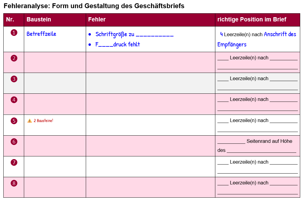 3. Schreiben Sie zu jedem Baustein die Fehler auf, die Ihnen aufgefallen sind.